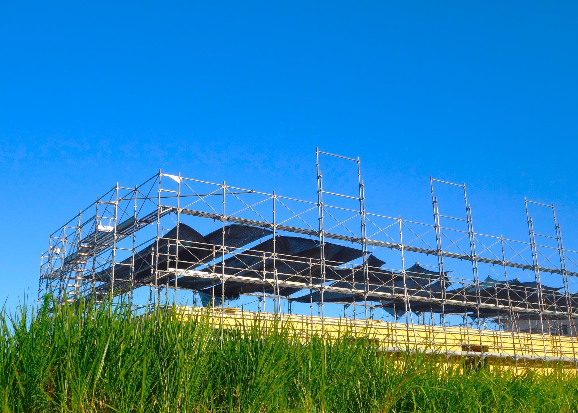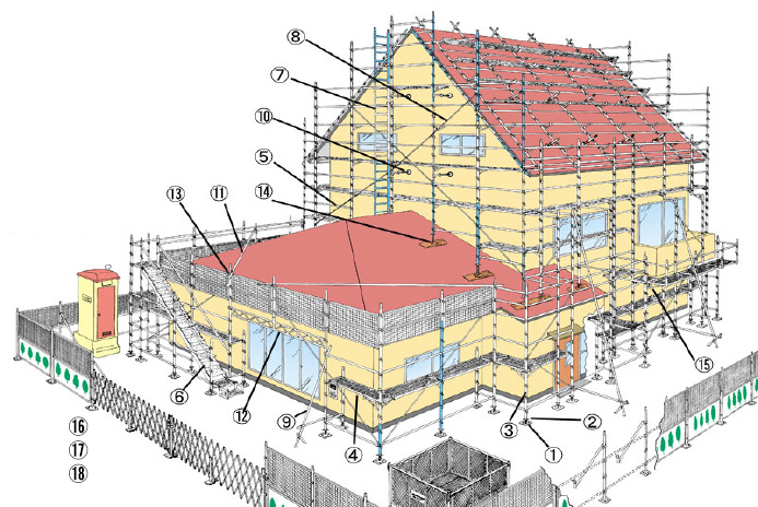 足場脚部より建地最上部まで設置します。足場場面に1カ所以上設置する。各構面ごとに、交互に向きを変えて施工する。45度前後になるように施工します。大筋交