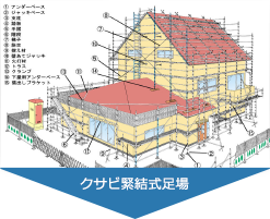 直交クランプや自在クランプ、3連クランプ、大筋交クランプ等が使用されることが多い。仮設工業会認定品を使用すること。クランプ